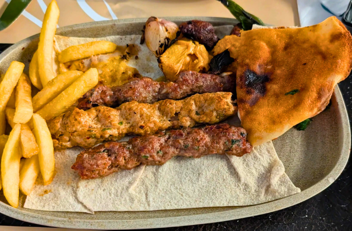 Thịt lạc đà xay mịn, tẩm ướp nhẹ và nướng thơm, ăn kèm phô mai, rau tươi và bánh mì mềm.