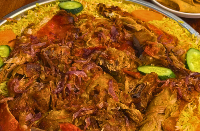 Gạo basmati dài hạt nấu cùng thịt cừu, gà hoặc tôm, thêm nghệ, quế, đinh hương và sữa chua.