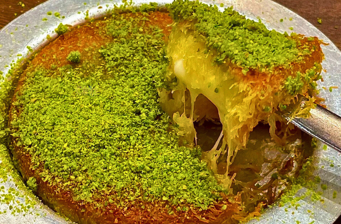 Phô mai mềm kẹp giữa lớp bánh mì sợi mỏng, rưới mật ong và hạt dẻ cười nghiền nhỏ.