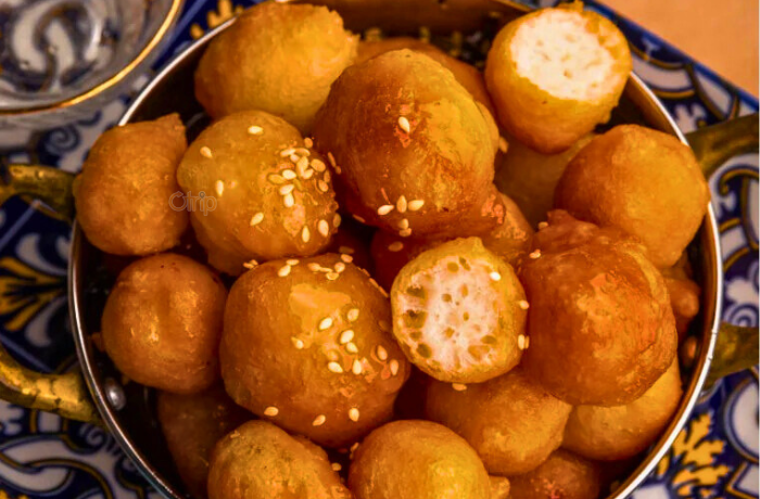 Bánh chiên viên tròn, giòn ngoài mềm trong, rưới mật chà là hoặc siro đường nghệ tây.