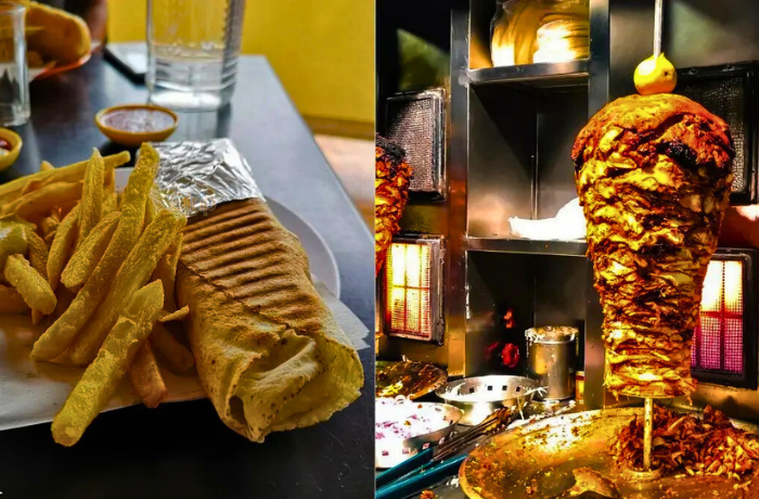Thịt gà hoặc bò nướng quay chậm trên trục xoay, kẹp trong bánh mì pita cùng rau tươi và sốt tỏi béo ngậy.