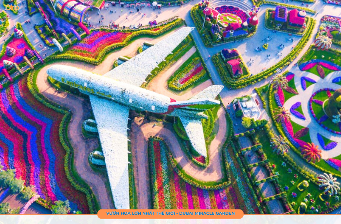 Dubai Miracle Garden là vườn hoa tự nhiên lớn nhất hành tinh. Diện tích hơn 72.000 m², quy tụ 150 triệu bông hoa đa sắc. Tác phẩm hoa mô phỏng máy bay Airbus A380 là điểm nhấn ấn tượng.